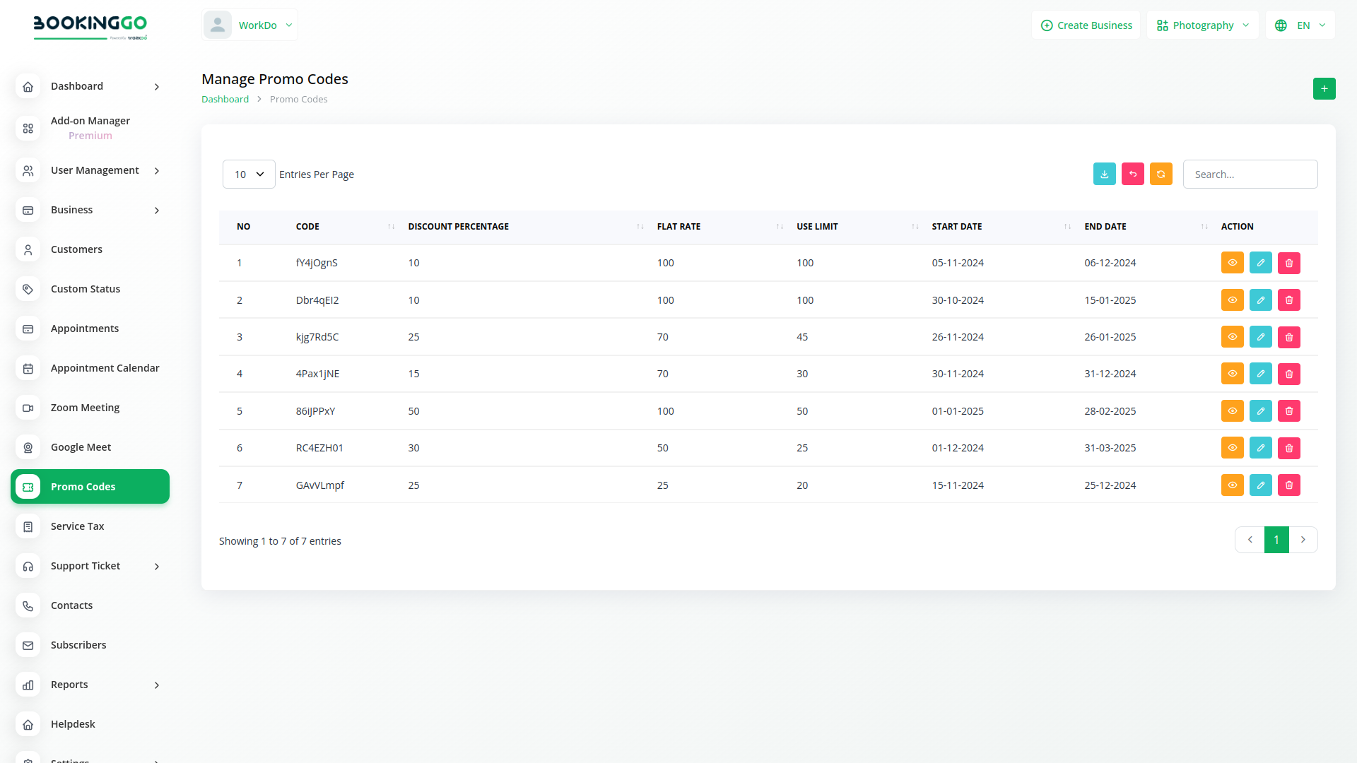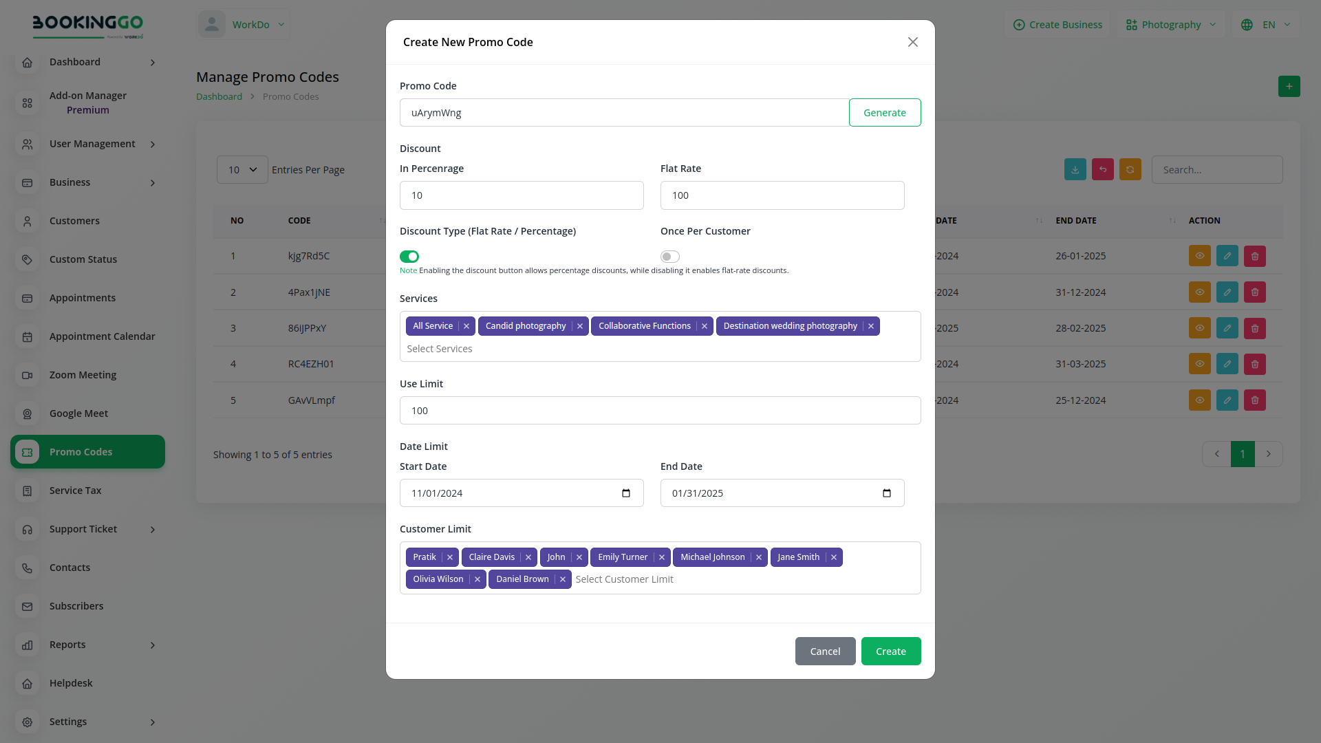 Businesses can easily generate promo codes within the Bookinggo SaaS platform. They have the flexibility to create unique codes with customizable parameters such as discount percentage, flat rate, validity period, and usage limits. This empowers businesses to tailor their promotions to align with their marketing objectives and target audience preferences.